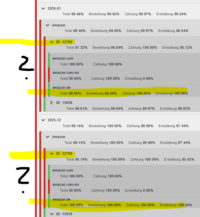 C: Im Dezember habe ich insgesamt 8 Bestellnummern für Erstattungen, die nicht im Datev-Export erscheinen. Diese finde ich auch nicht in der Umsatzmatrix. Wenn ich das richtig verstehe sucht Ihr bei einer Erstattung nach der dazugehörigen Bestellung. Findet Ihr eine, so wird der Umsatz auch im Umsatzreport ausgewiesen. Ist das richtig?